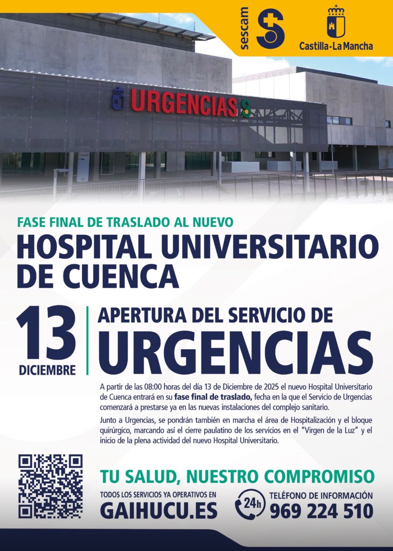 Desde la Delegación de la Junta en Cuenca nos informan que, a partir de las 08:00 horas del sábado 13 de diciembre de 2025, el nuevo Hospital Universitario de Cuenca entrará en su fase final de traslado.